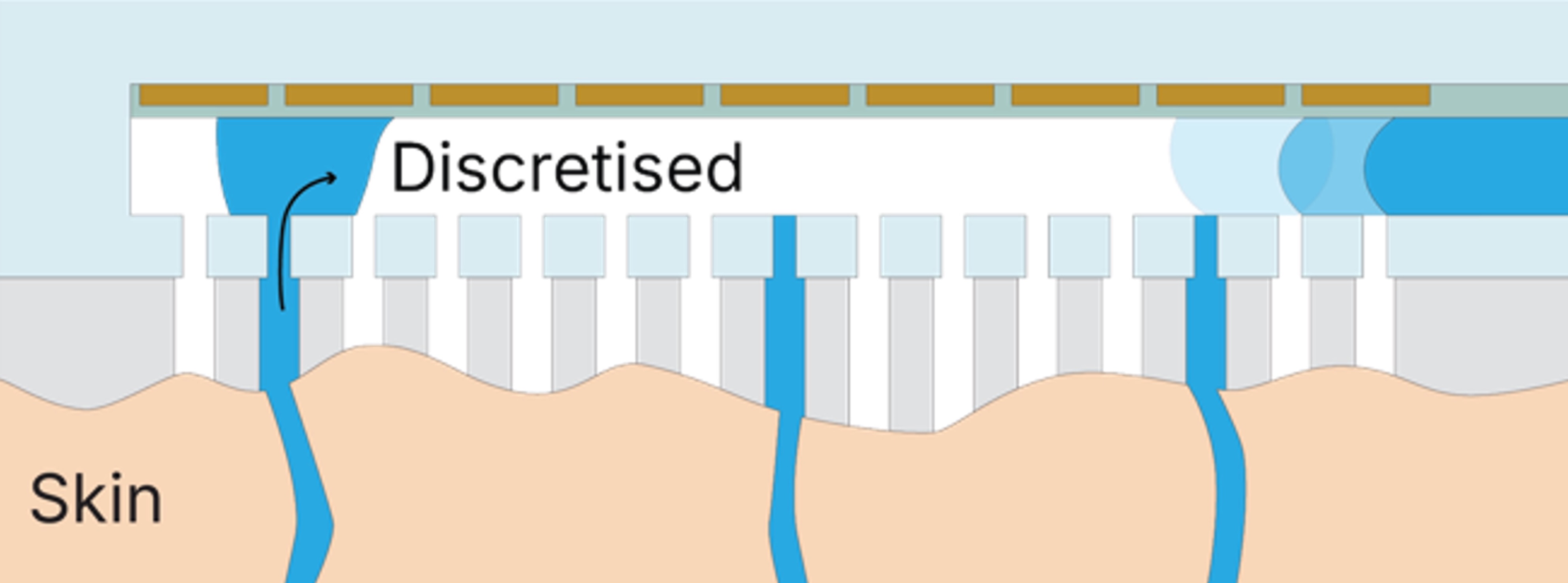 DXcrete is a spin-off company from the Microsystems group focused on the development of BEA, a platform which enables continuous and non-invasive biomarker monitoring in sweat. The BEA chip (Figure 1) is unique in that it can collect and analyze sweat at very low sweat rates, a capability that is essential for monitoring individuals during rest or normal daily activities. This is achieved by employing discretized microfluidics (also referred to as droplet microfluidics), as illustrated in Figure 2, rather than conventional continuous-flow microfluidic systems.[1]