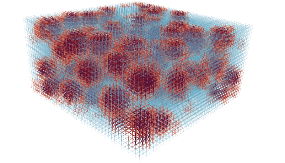 Fig 2: Microstructure-resolved discrete lattice model of 3DPC showing the cement matrix (blue) and embedded aggregates (red).